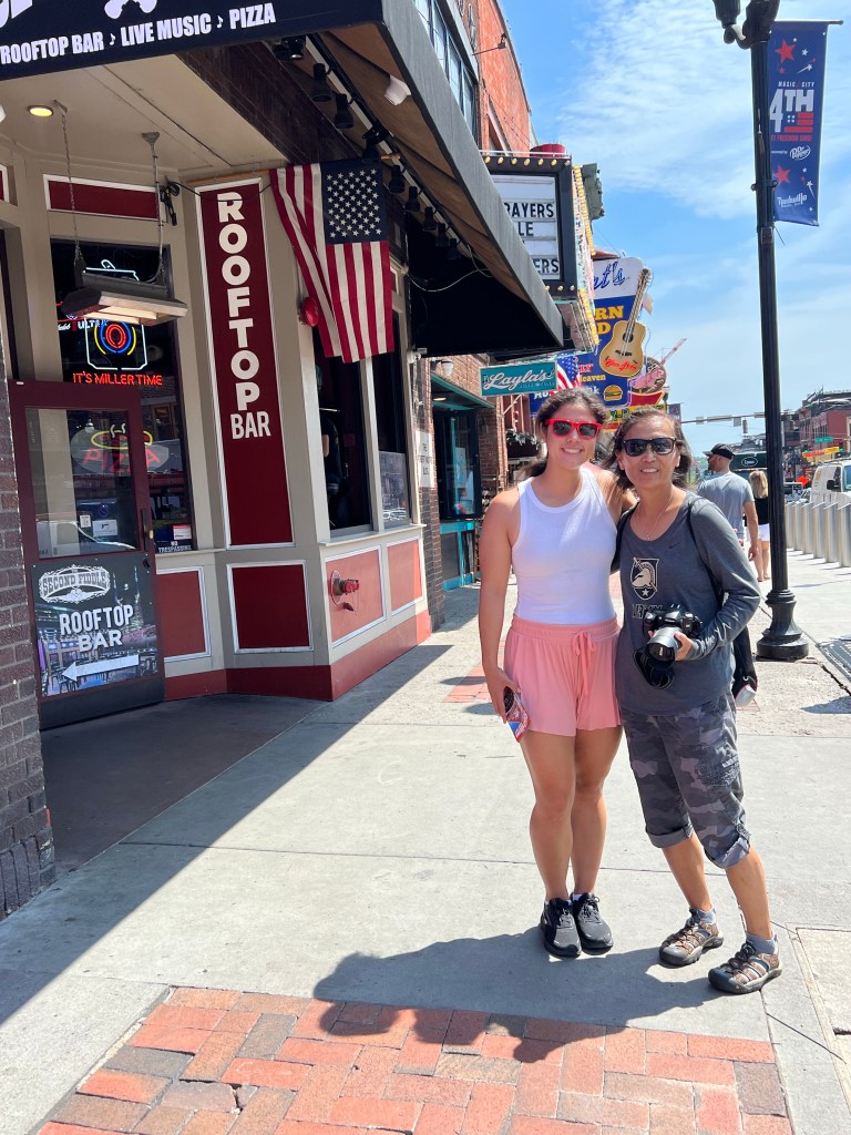 I woke abruptly to the intruder alarm going off. Later, it was discovered that it was set off by Mom going outside to look at the garden (thanks). We had coffee and started our sightseeing in downtown Nashville. We walked across the pedestrian bridge and through the downtown area—Nashville is much smaller than I had expected. We stopped for lunch at Ole Red bbq. The brisket was mid but the views were very nice! We went to the Belmont Mansion next, guarded by the fiercest of lions. Then we packed up our stuff and set off to Memphis. Mom was super motivated to drive and ended up driving the whole way. Three hours later we were greeted by Mom’s friend, Anna, as well as her two dogs, Leila and Taylor. Both dogs LOVE to lick and had a feast on my legs- Mom was NOT going to let that happen!We settled in and went to the Germantown Commissary for BBQ (yes, it’s a restaurant). We finished up the night hanging with the dogs and looking over old photos. – Kristen